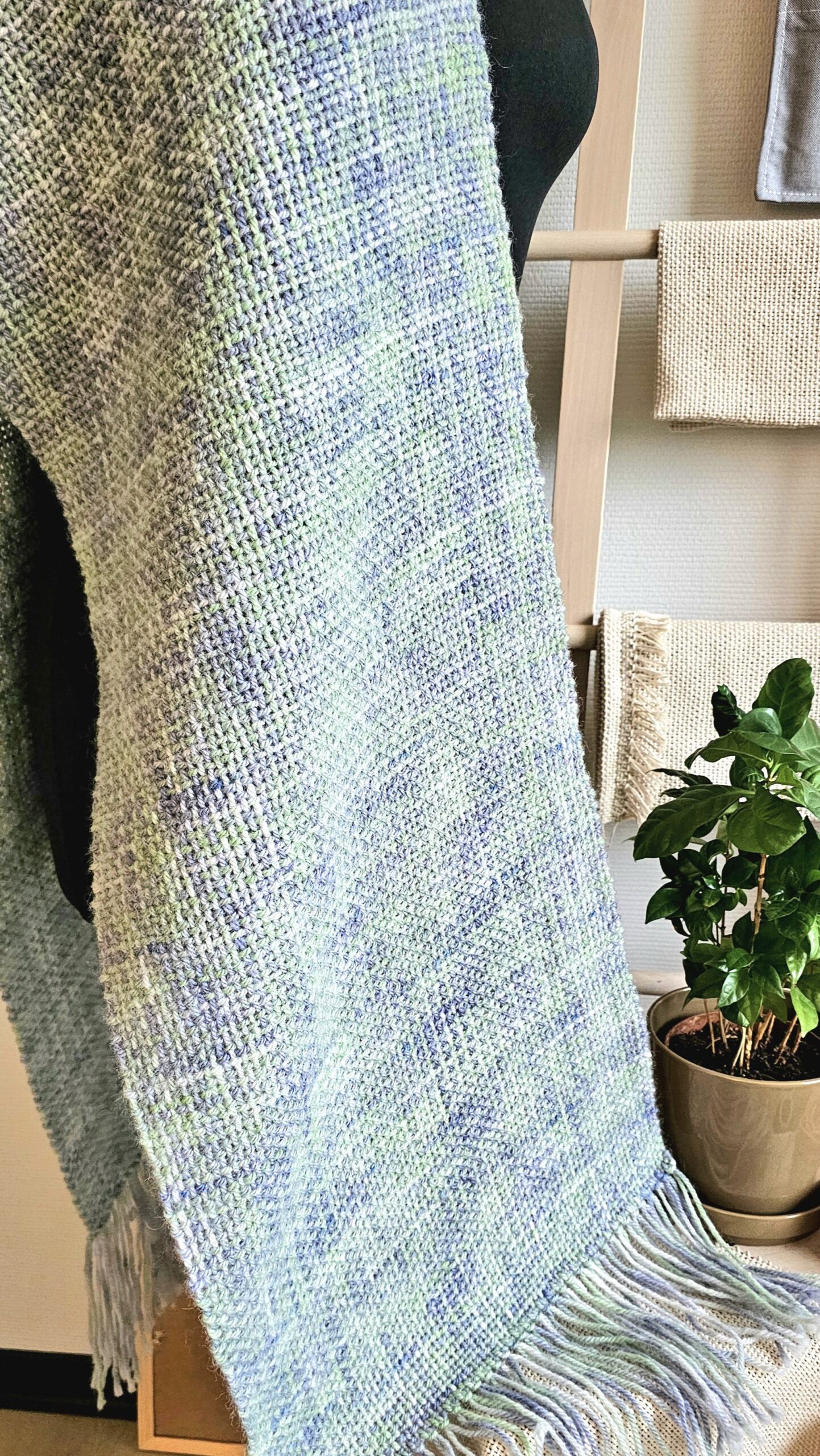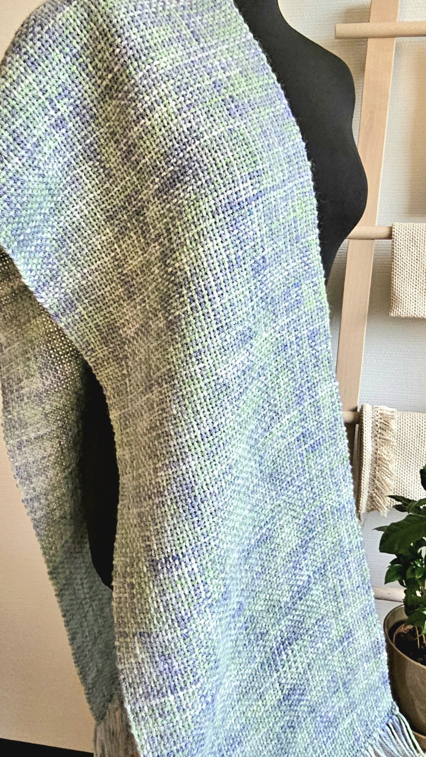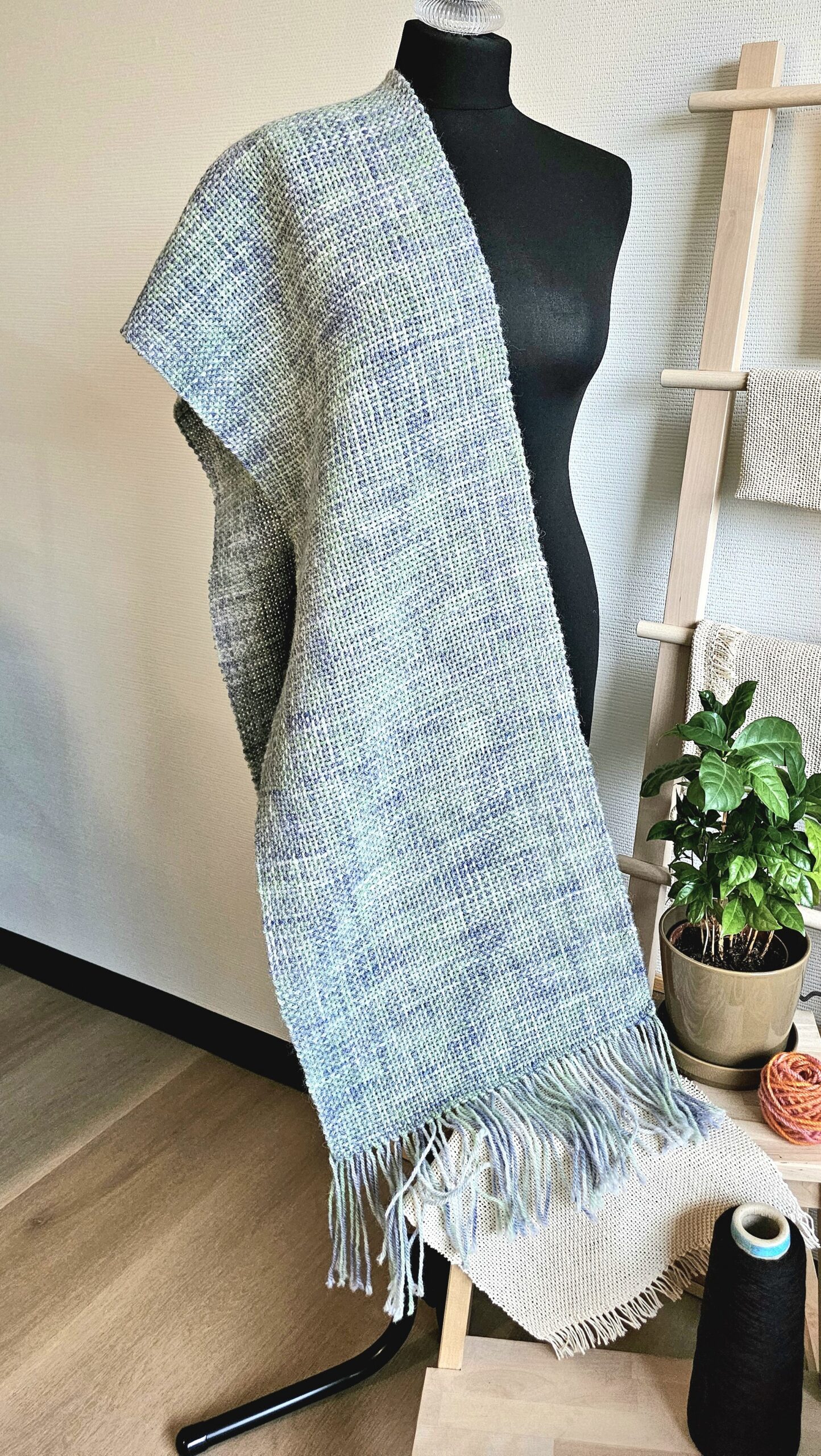 Handwoven scarf made from 100% sheep’s wool, a very warm winter scarf. The wool is hand-dyed, in navy blue and dusty light green colors, size: 186 cm x 34 cm
