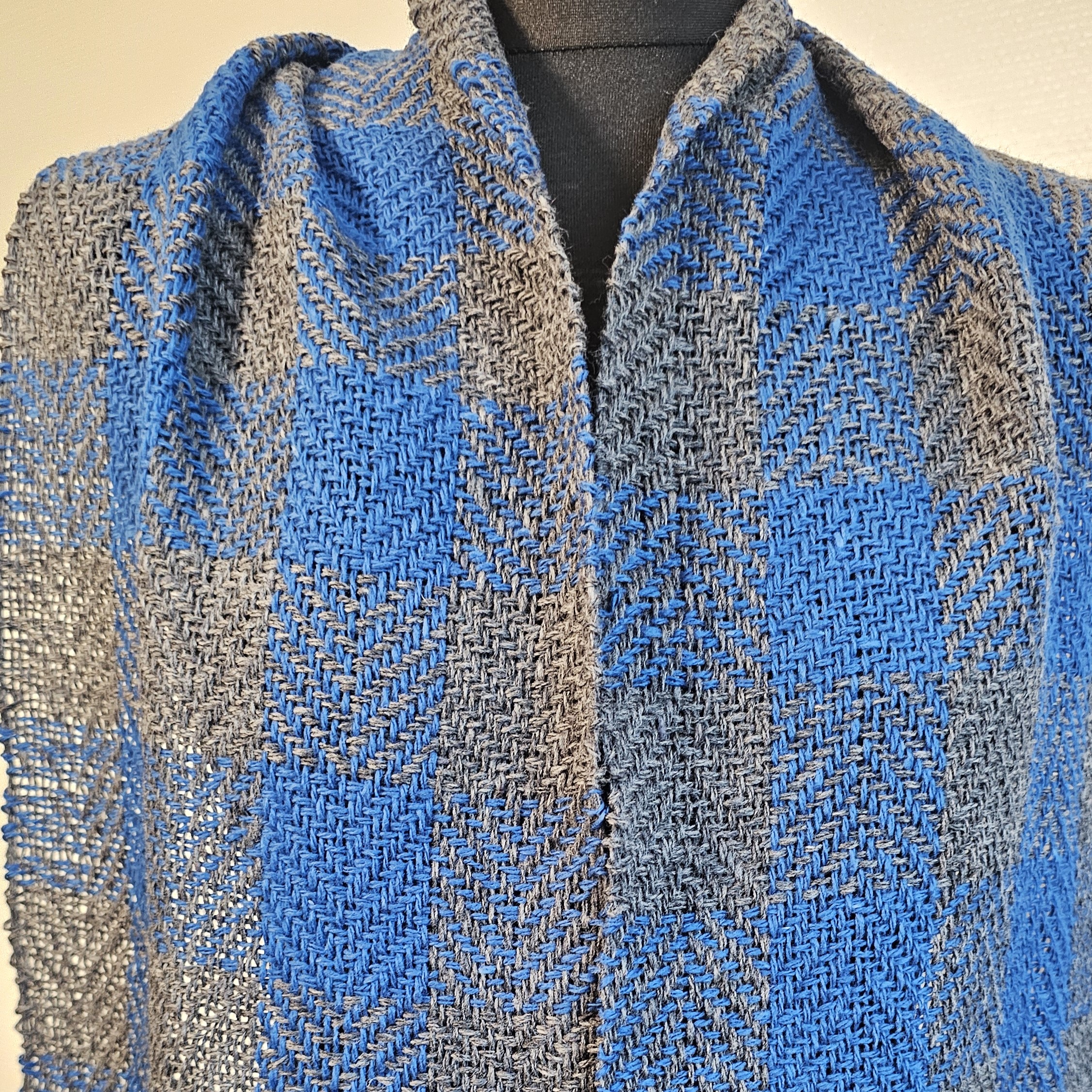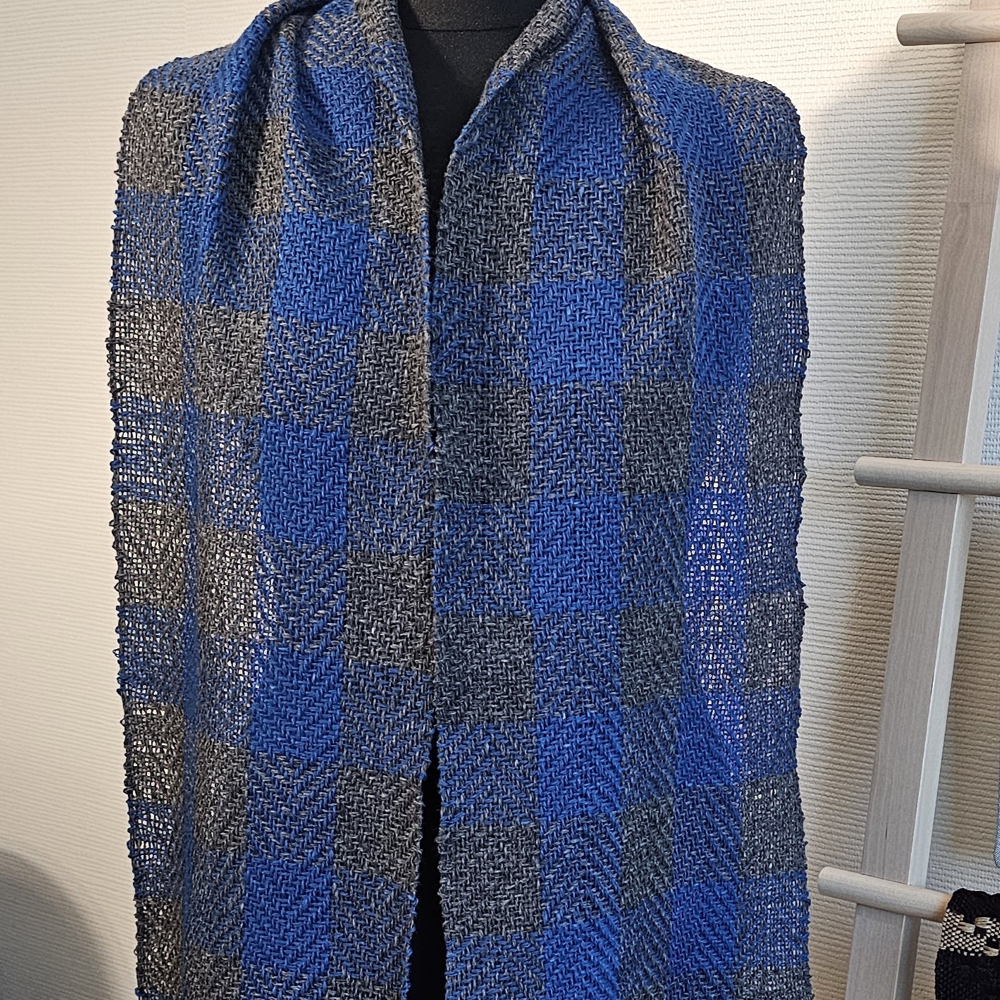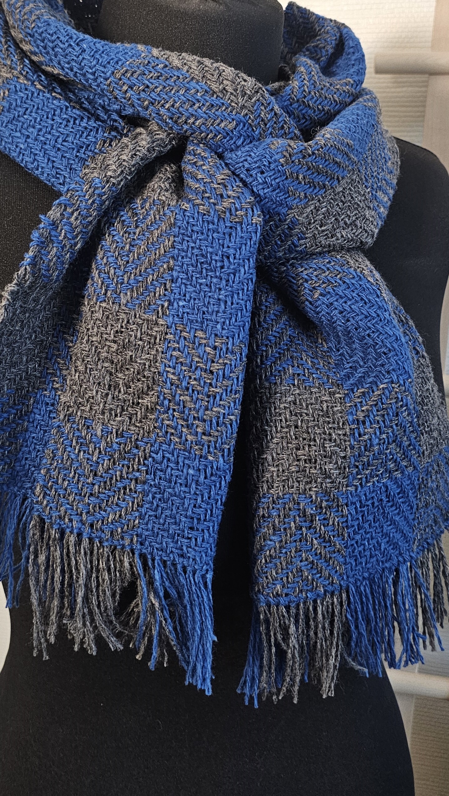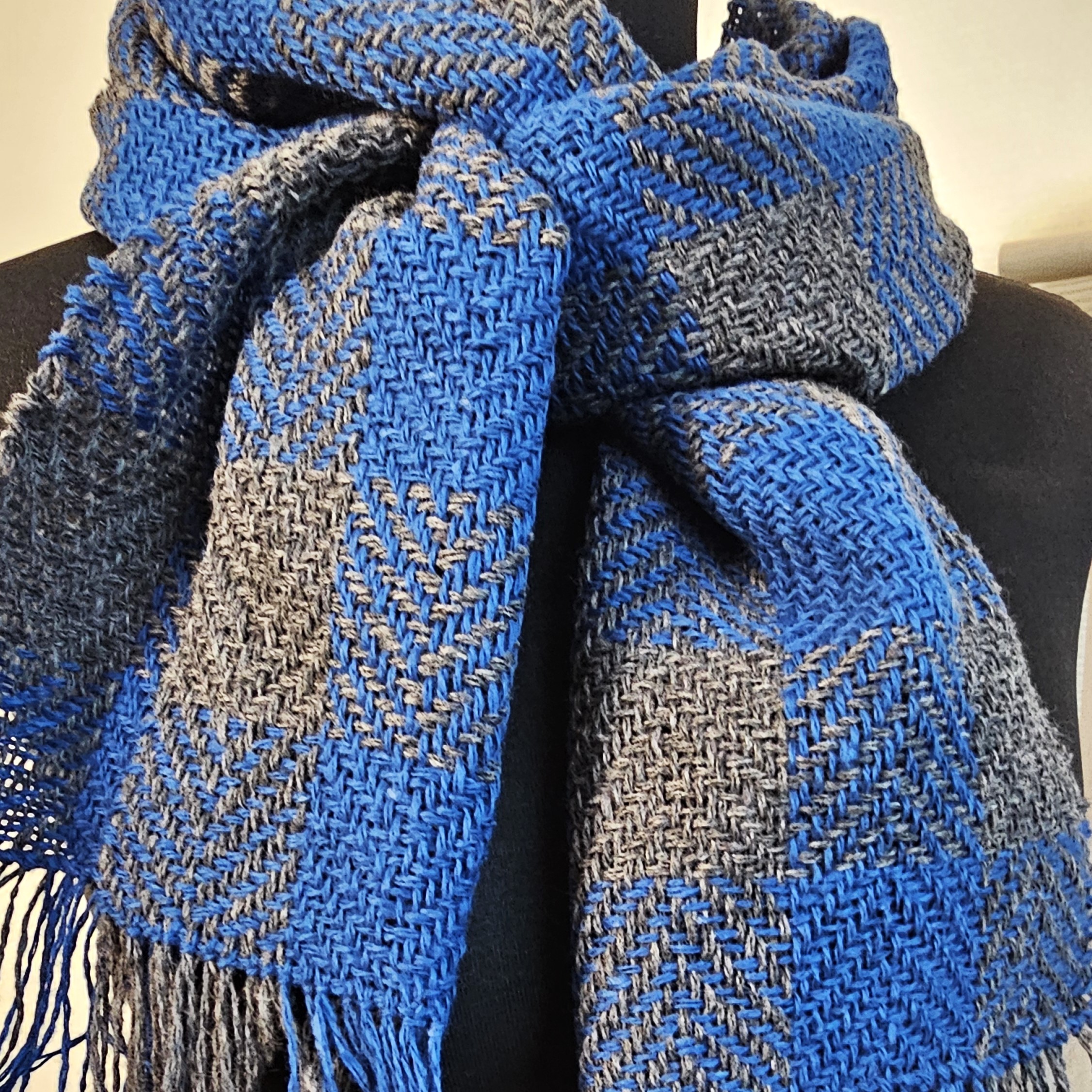 A warm and soft Blue Gray twill scarf plaid Tweed Wool made of high-quality italian 100% tweed yarn , hand-woven on the loom, size: 180 cm x 24 cm