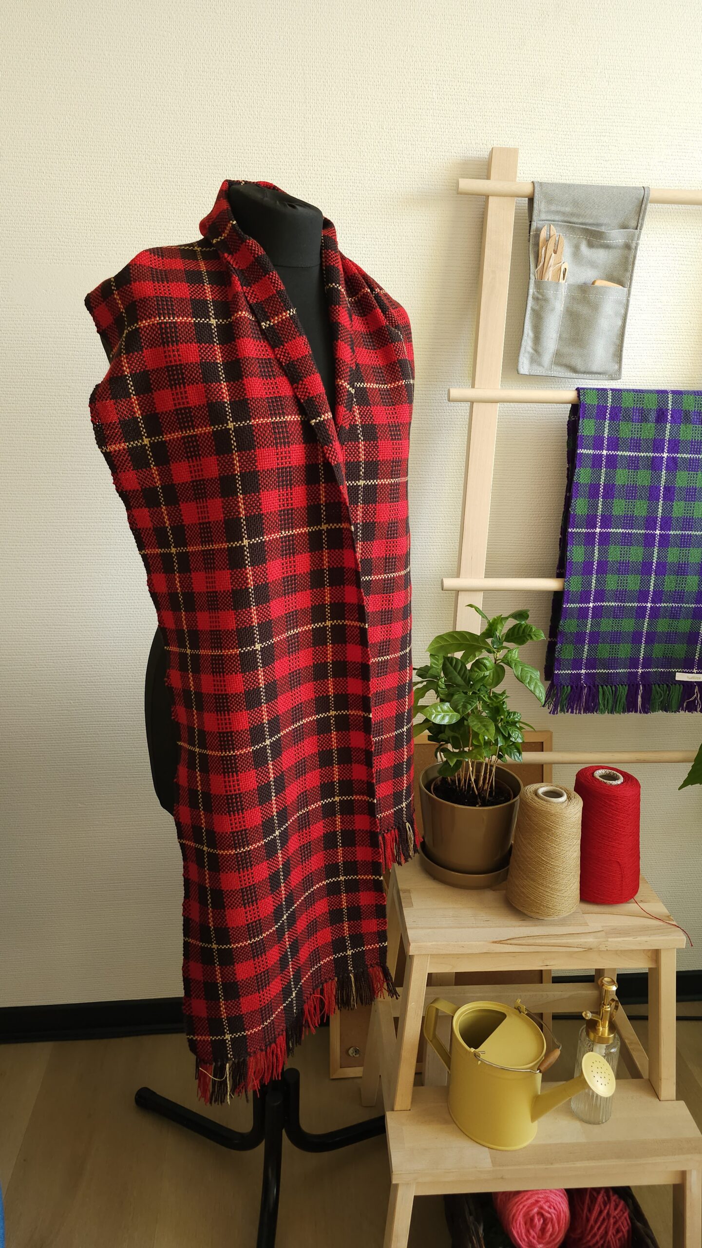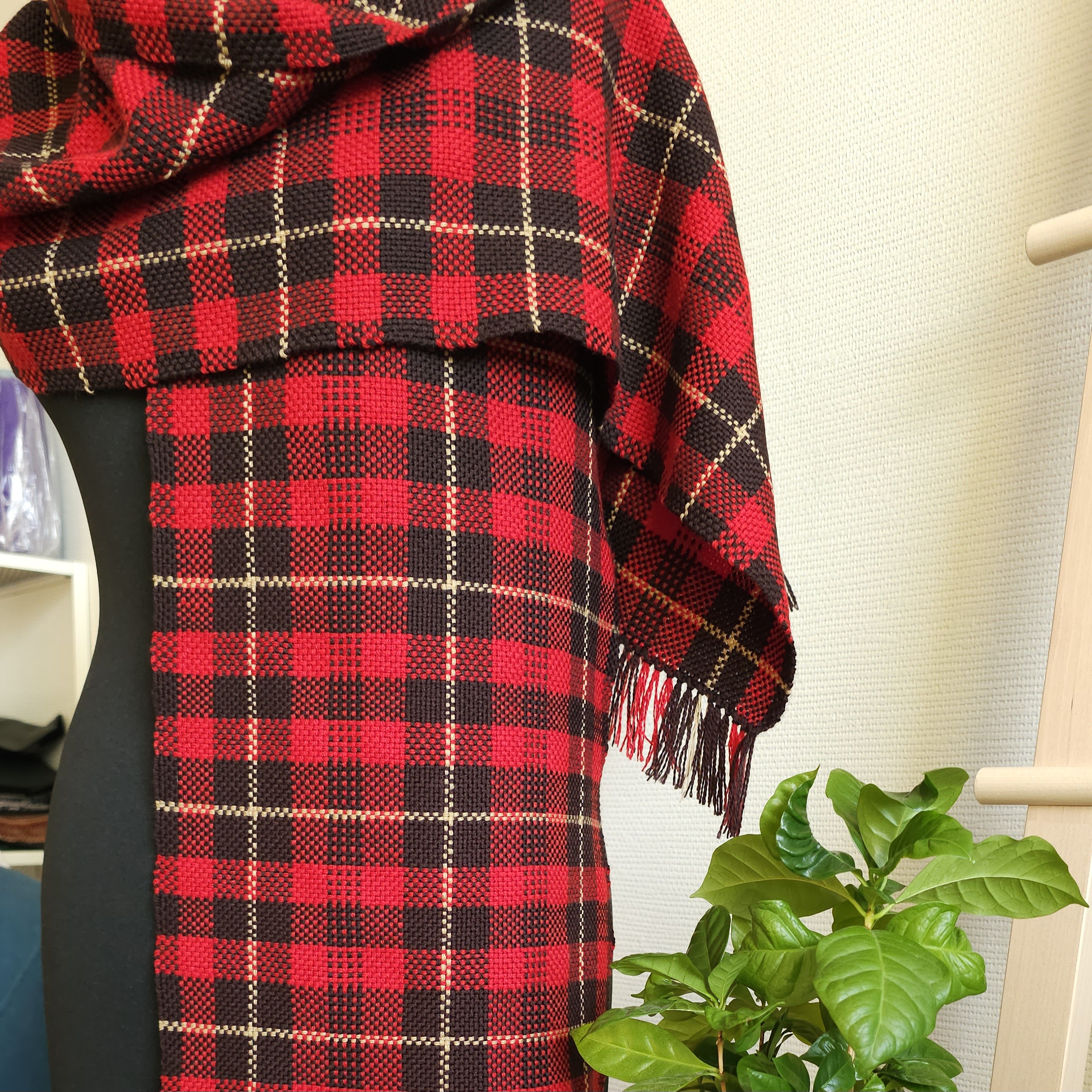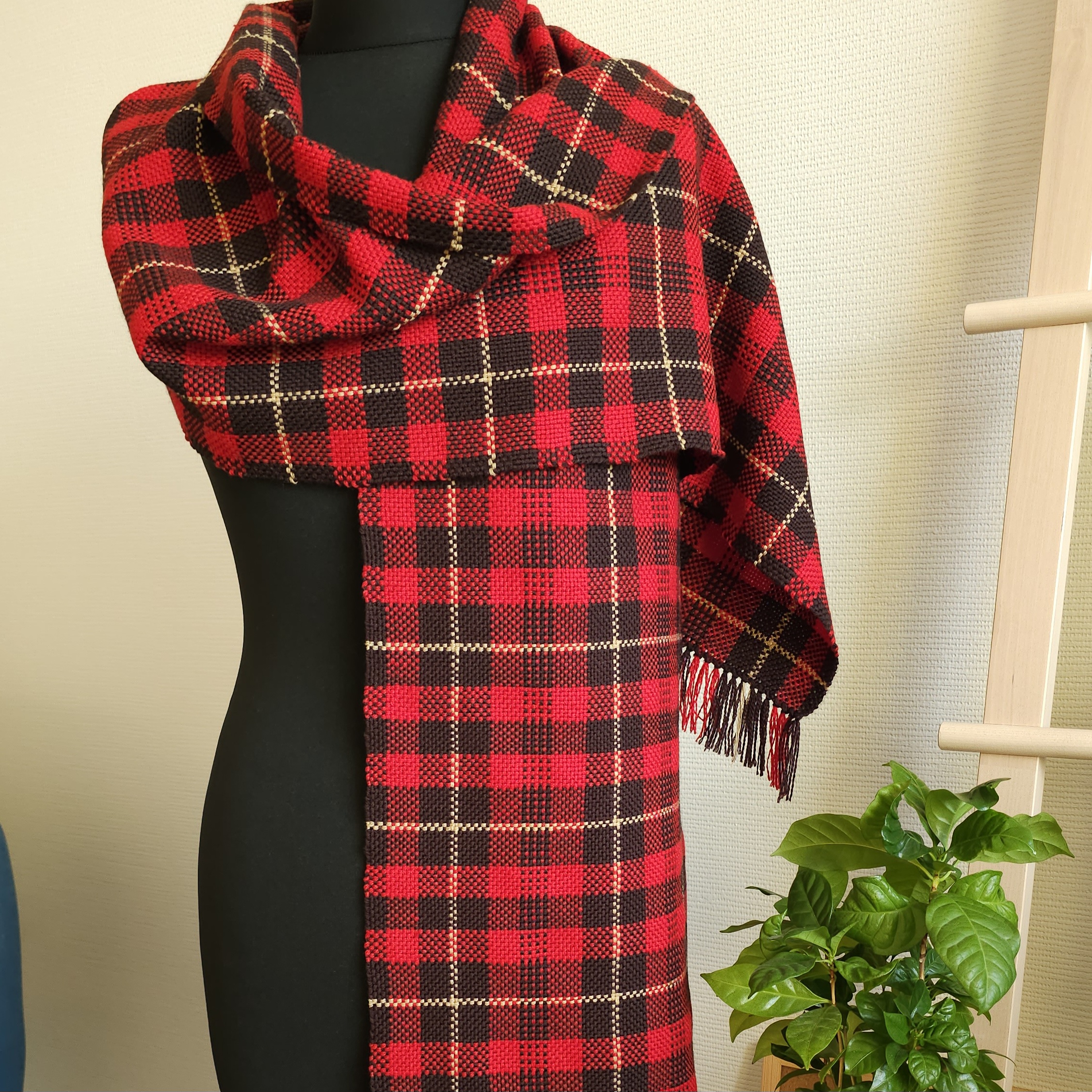 A warm and soft tartan patern Brown Red Biege scarf made of high-quality 100% italian merino wool yarn , hand-woven, size: 193 cm x 28 cm