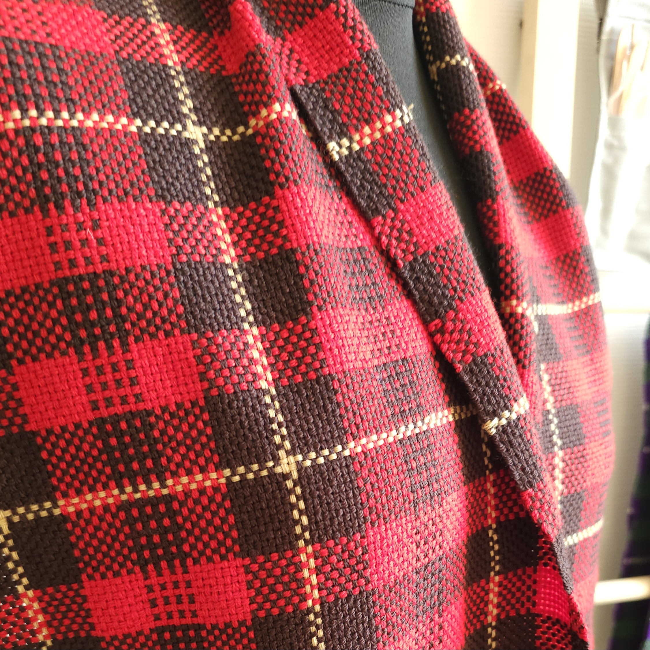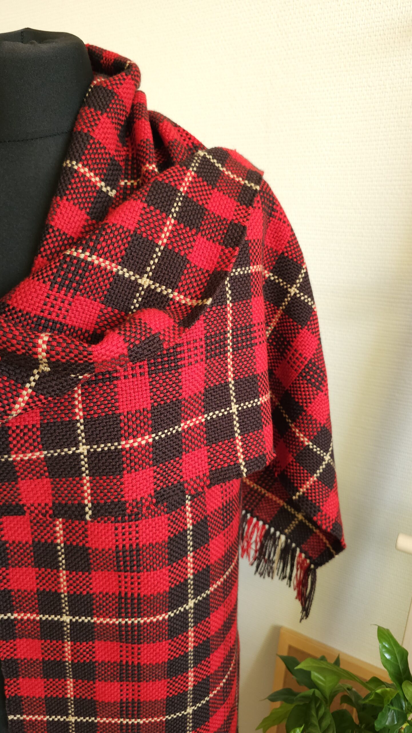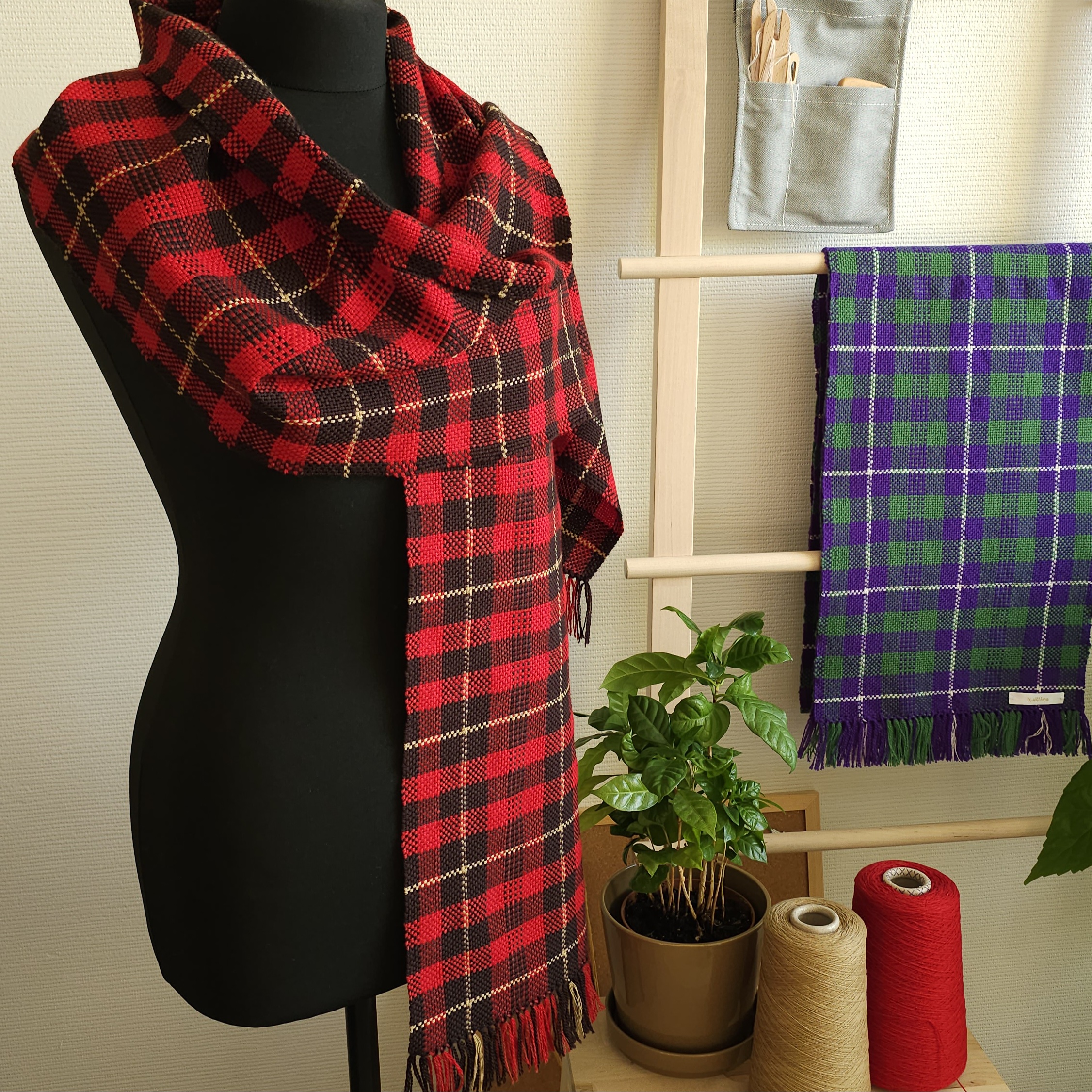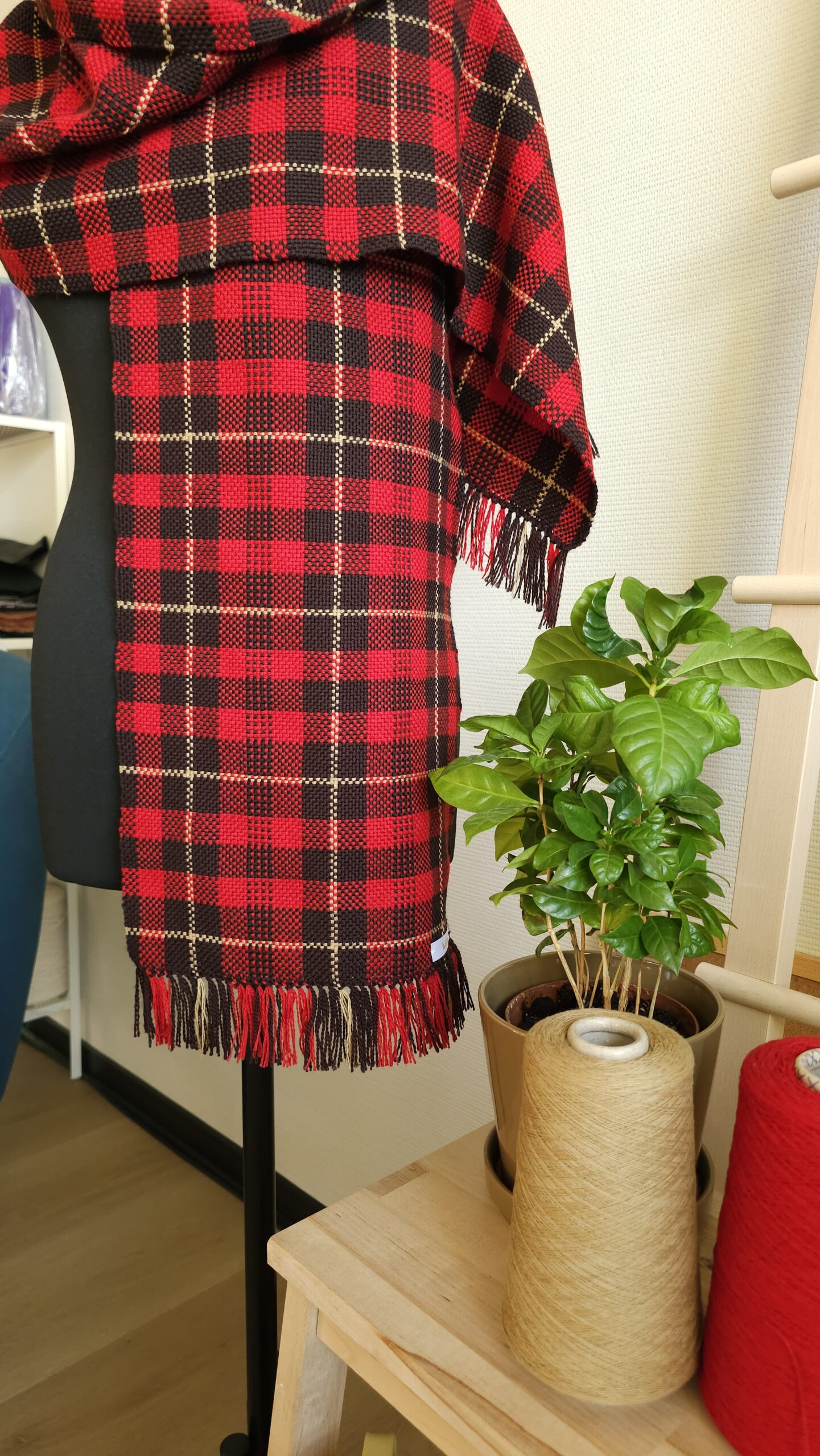 A warm and soft tartan patern Brown Red Biege scarf made of high-quality 100% italian merino wool yarn , hand-woven, size: 193 cm x 28 cm