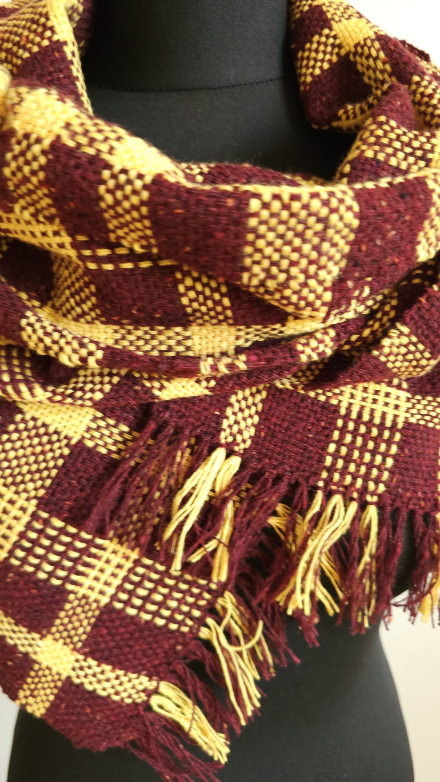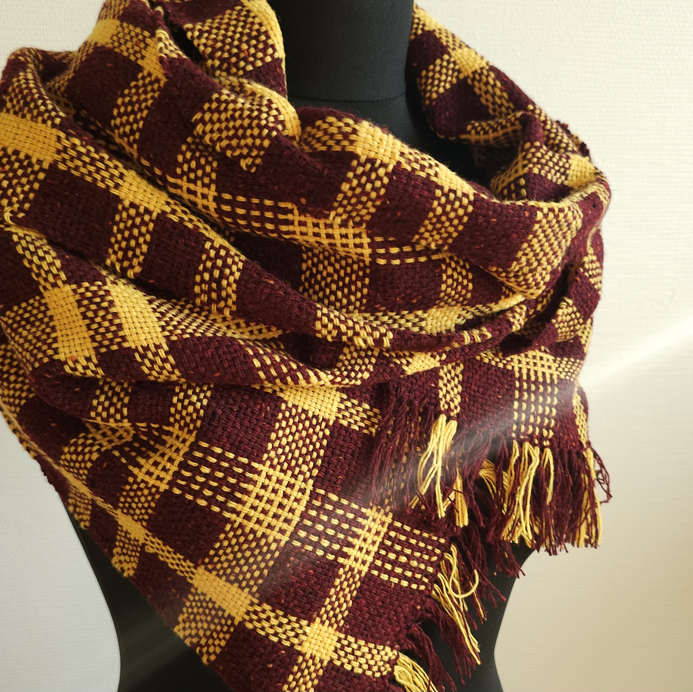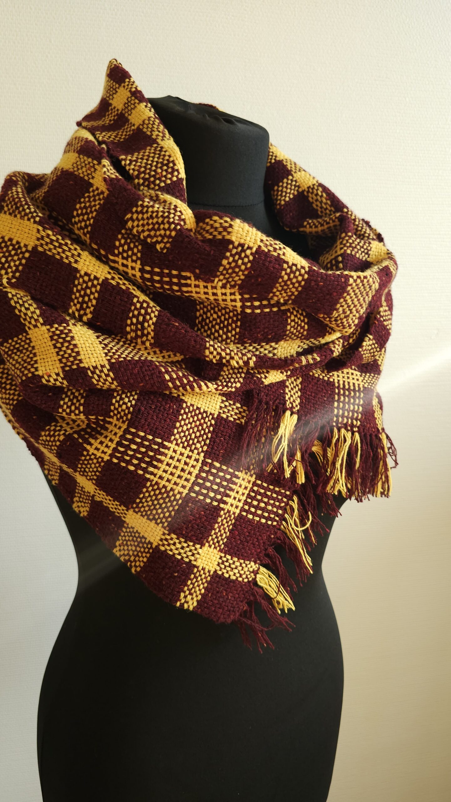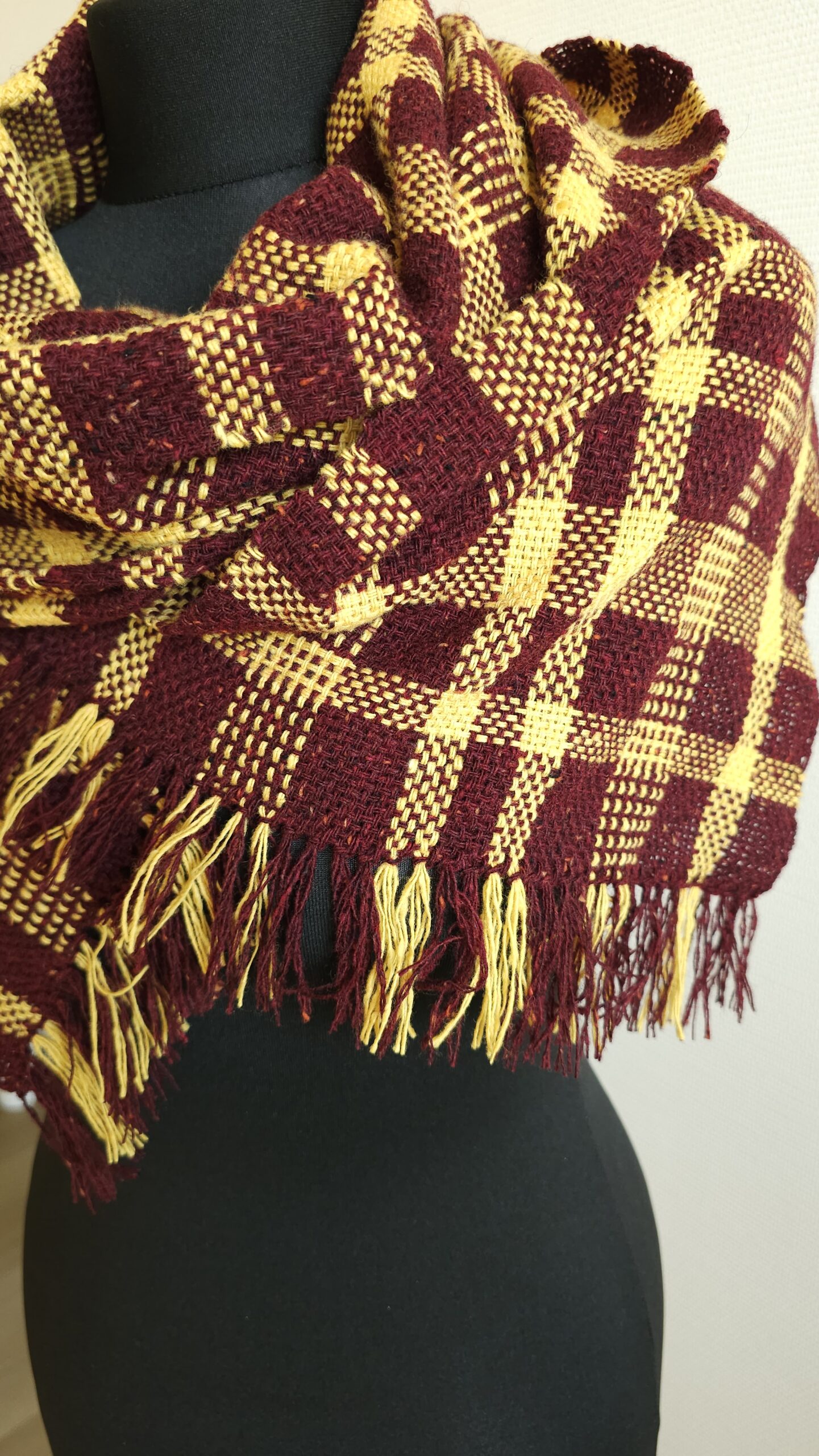 A warm and soft Dark Red Yellow scarf made of high-quality 100% italian tweed wool yarn , hand-woven, size: 188 cm x 29 cm