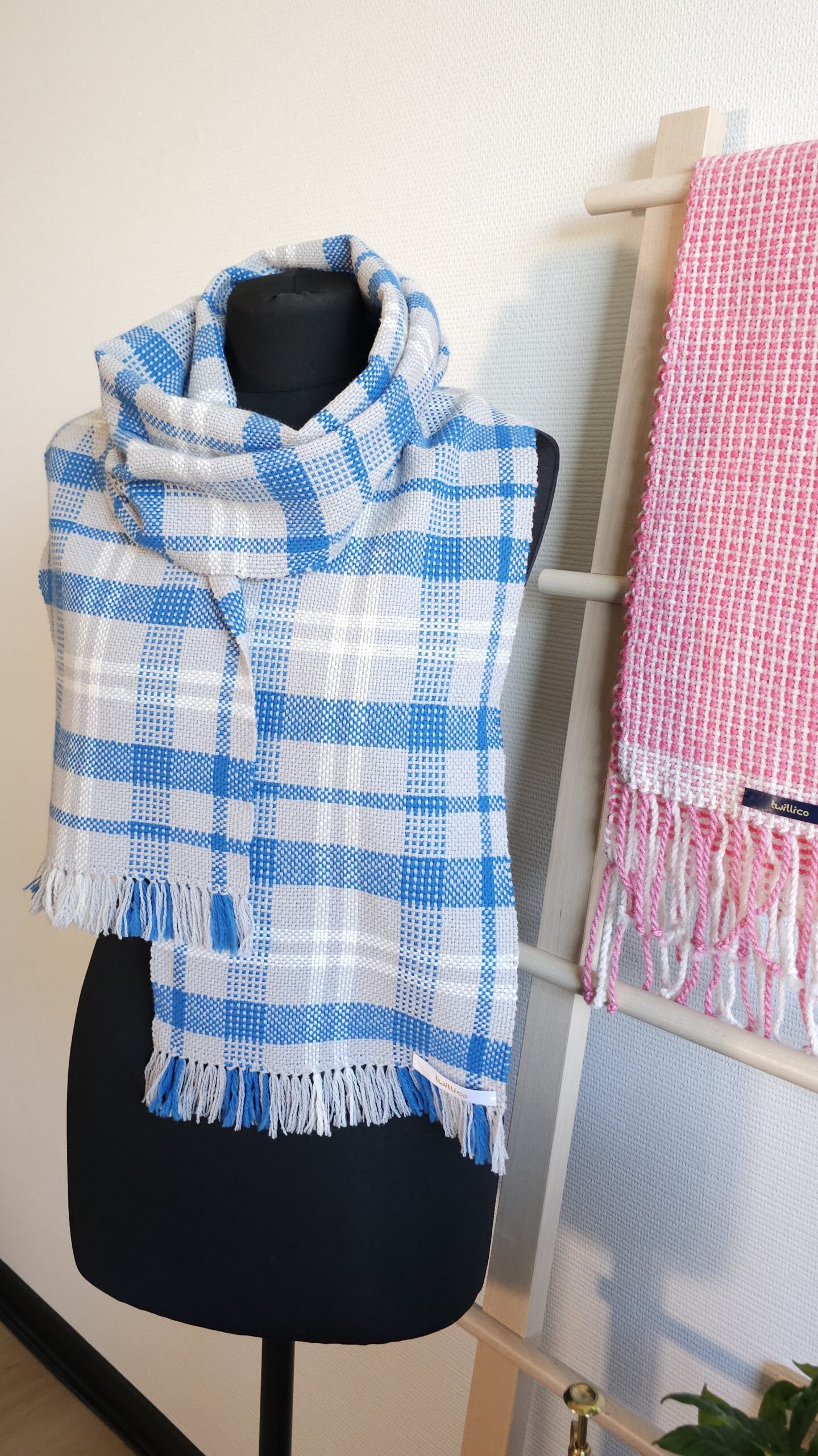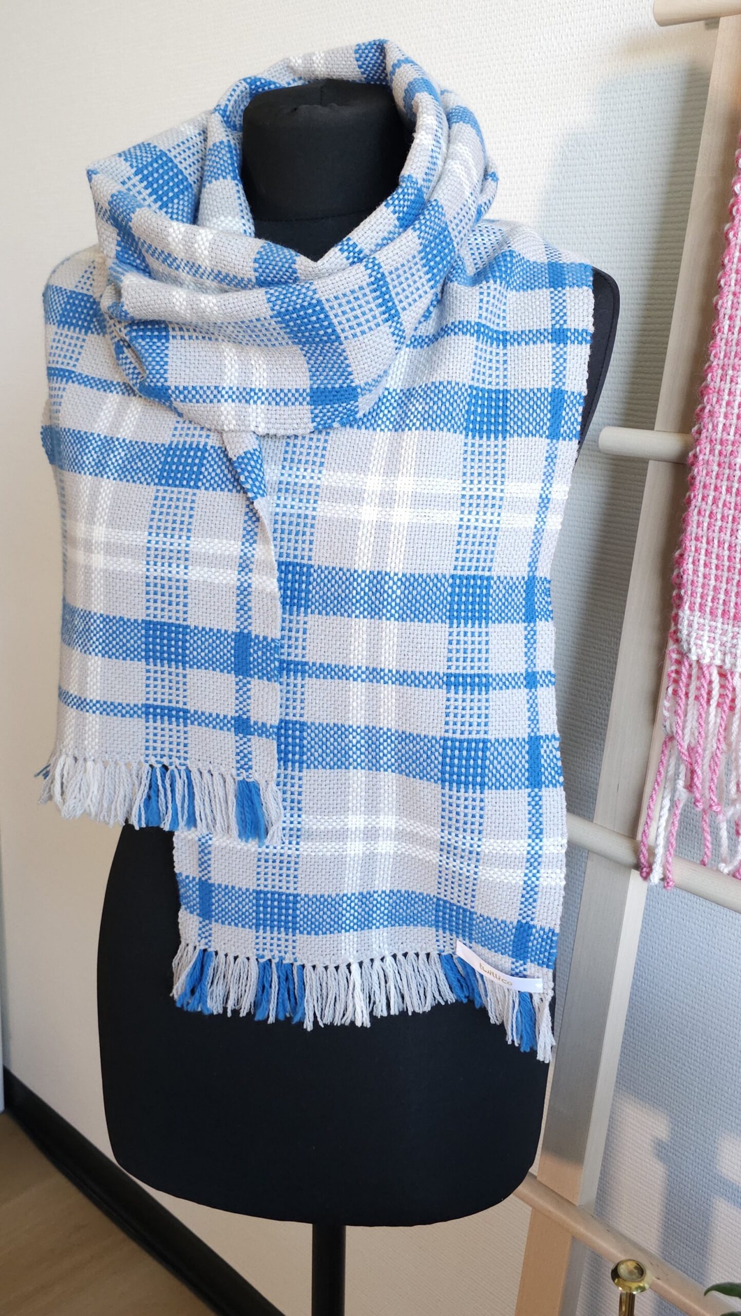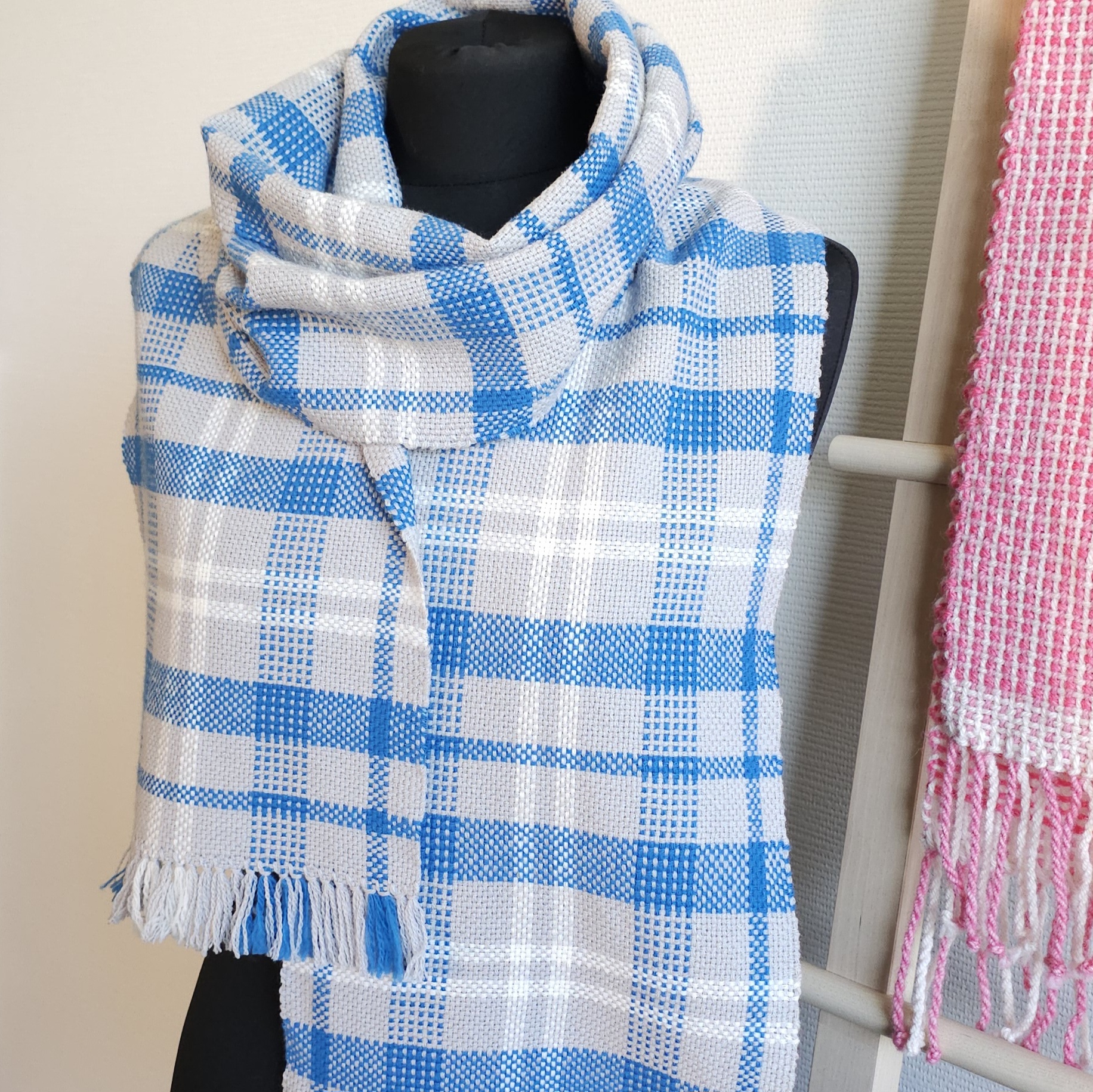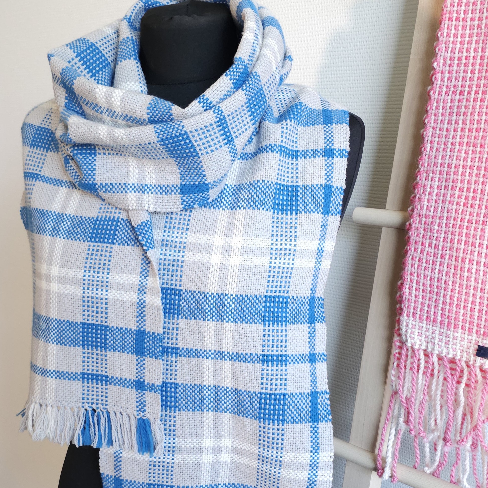 A warm and soft Light grey blue White scarf made of high-quality 100% italian merino wool yarn , hand-woven, size: 192 cm x 23 cm
