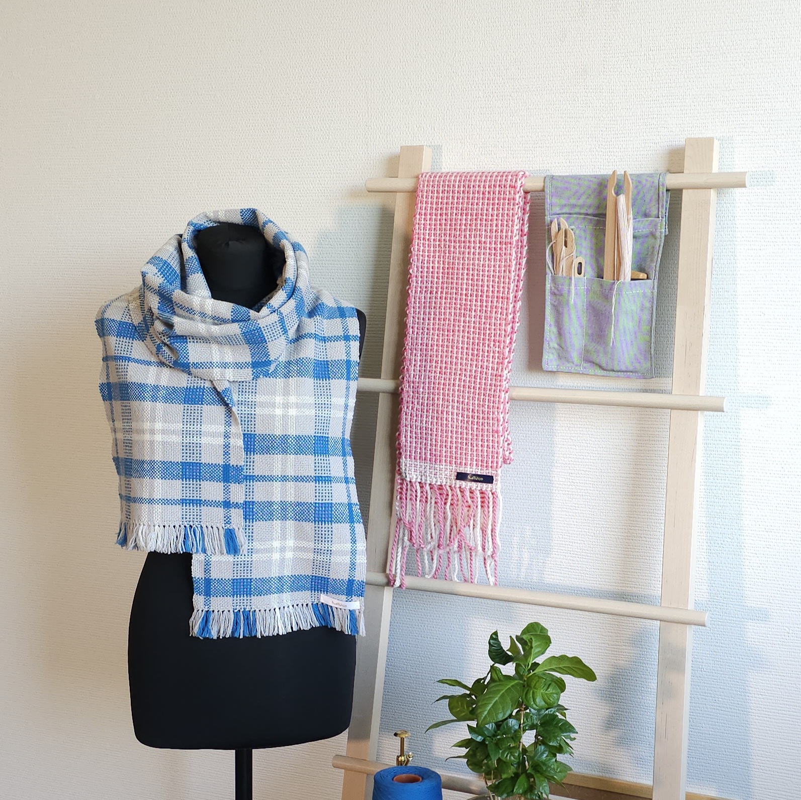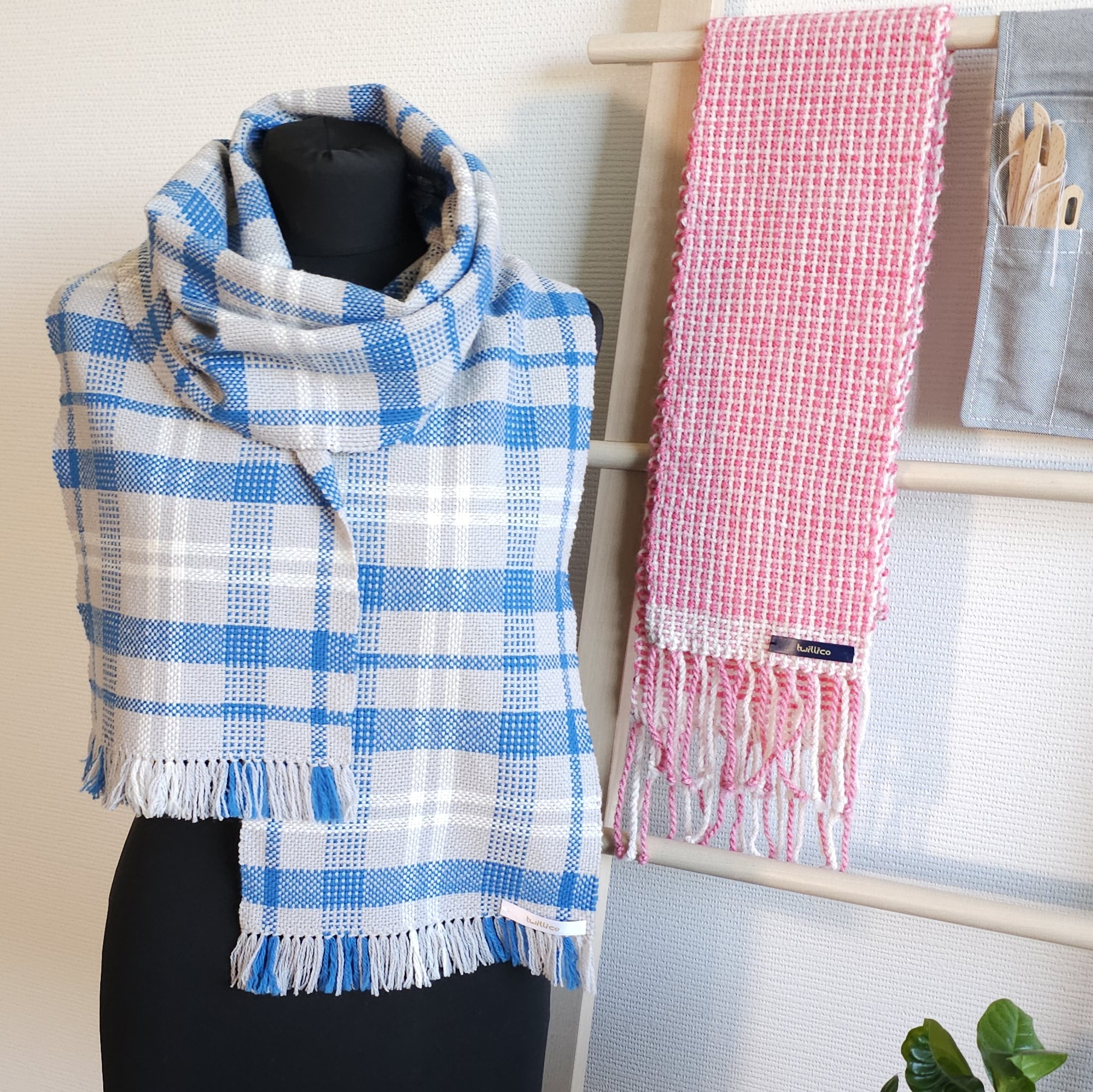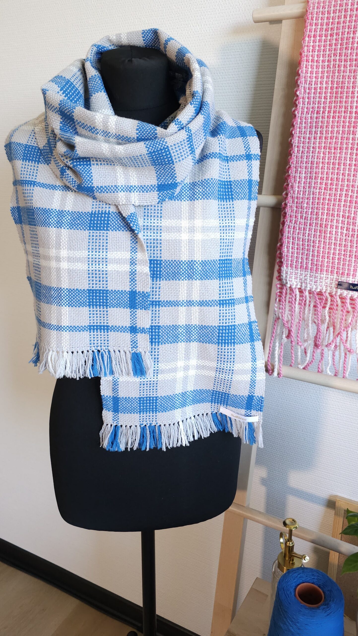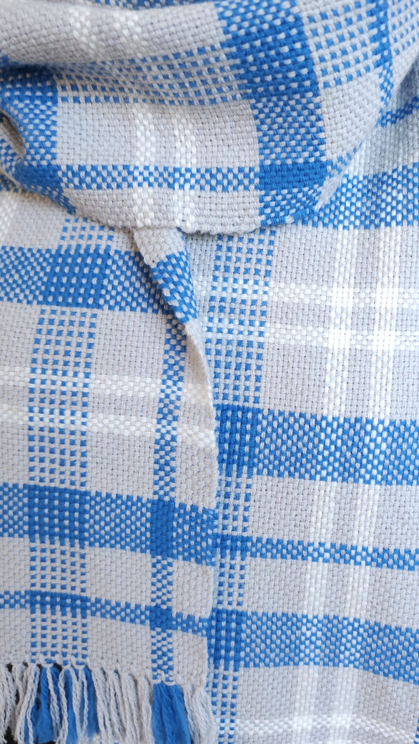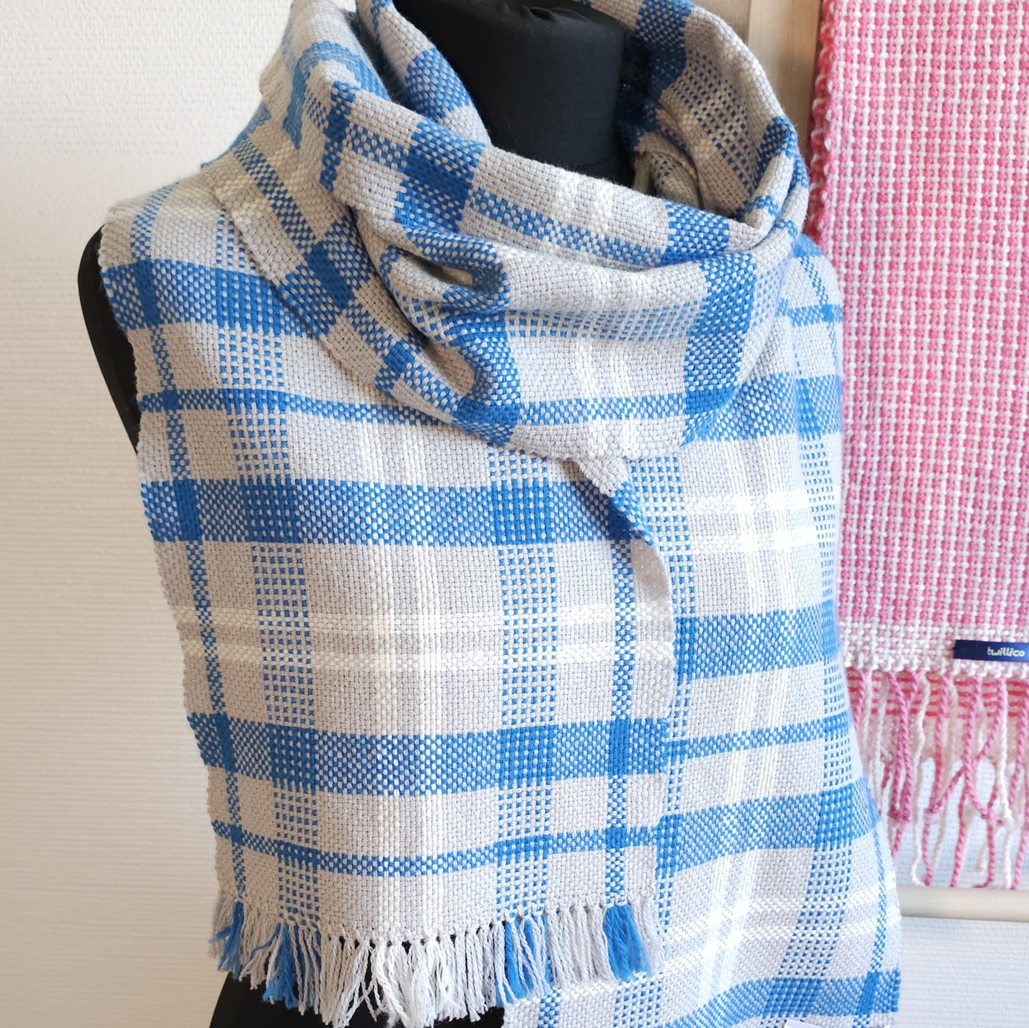 A warm and soft Light grey blue White scarf made of high-quality 100% italian merino wool yarn , hand-woven, size: 192 cm x 23 cm