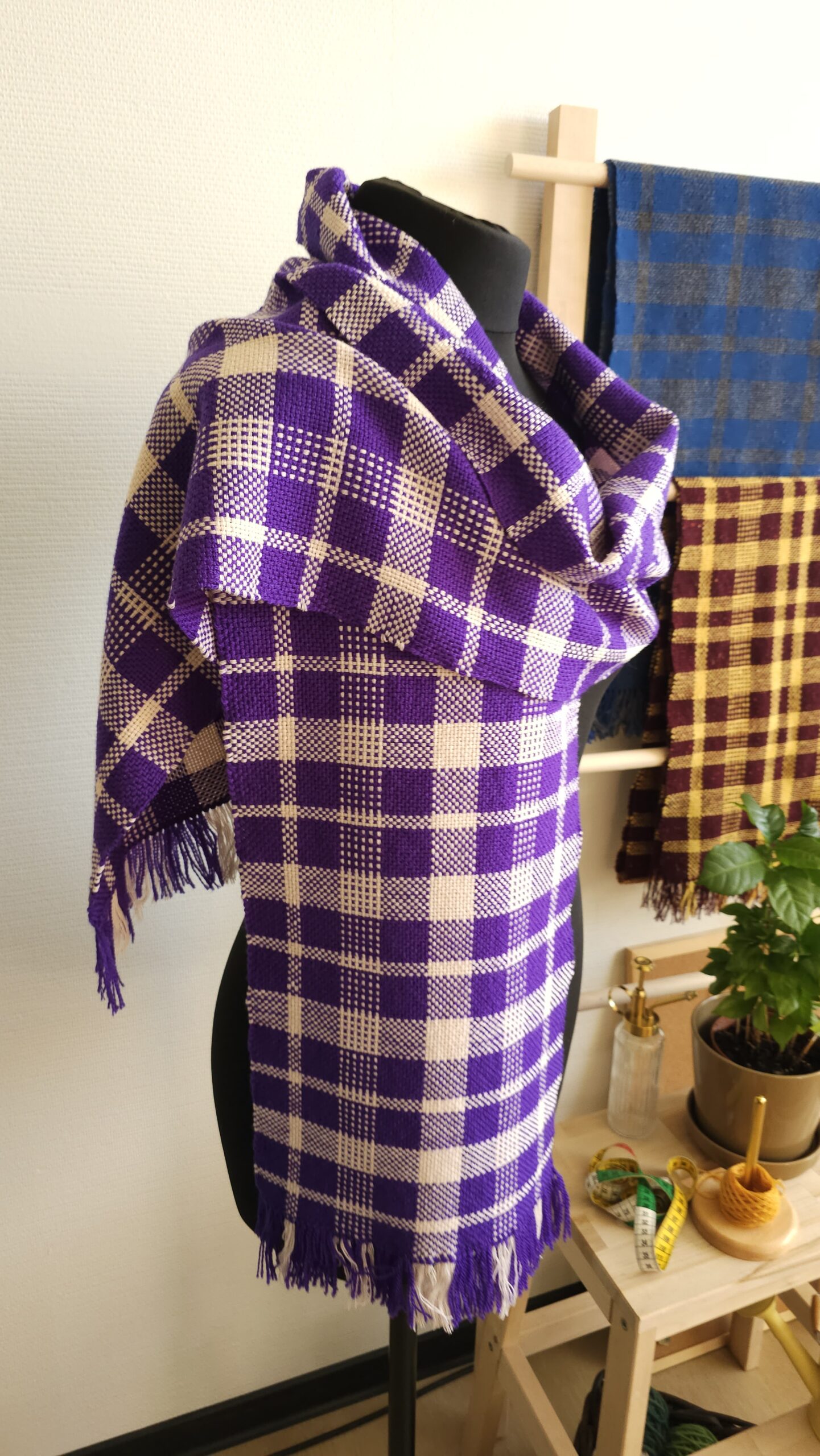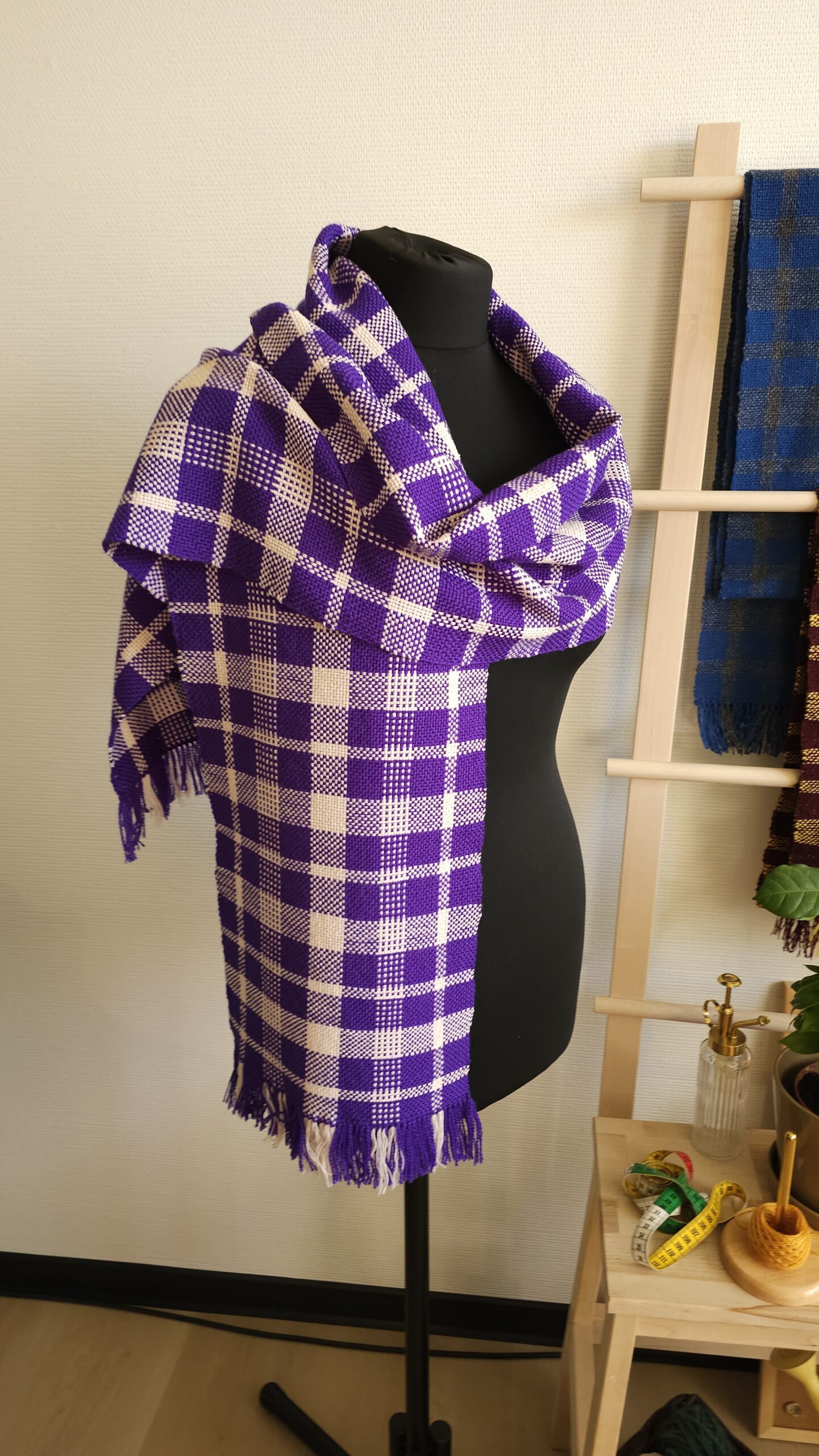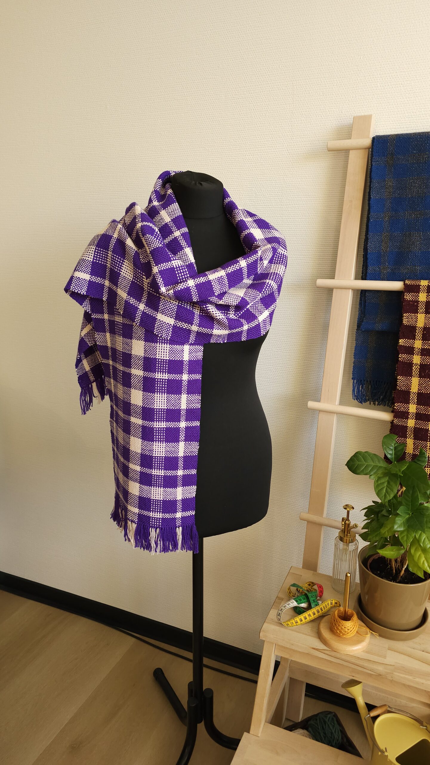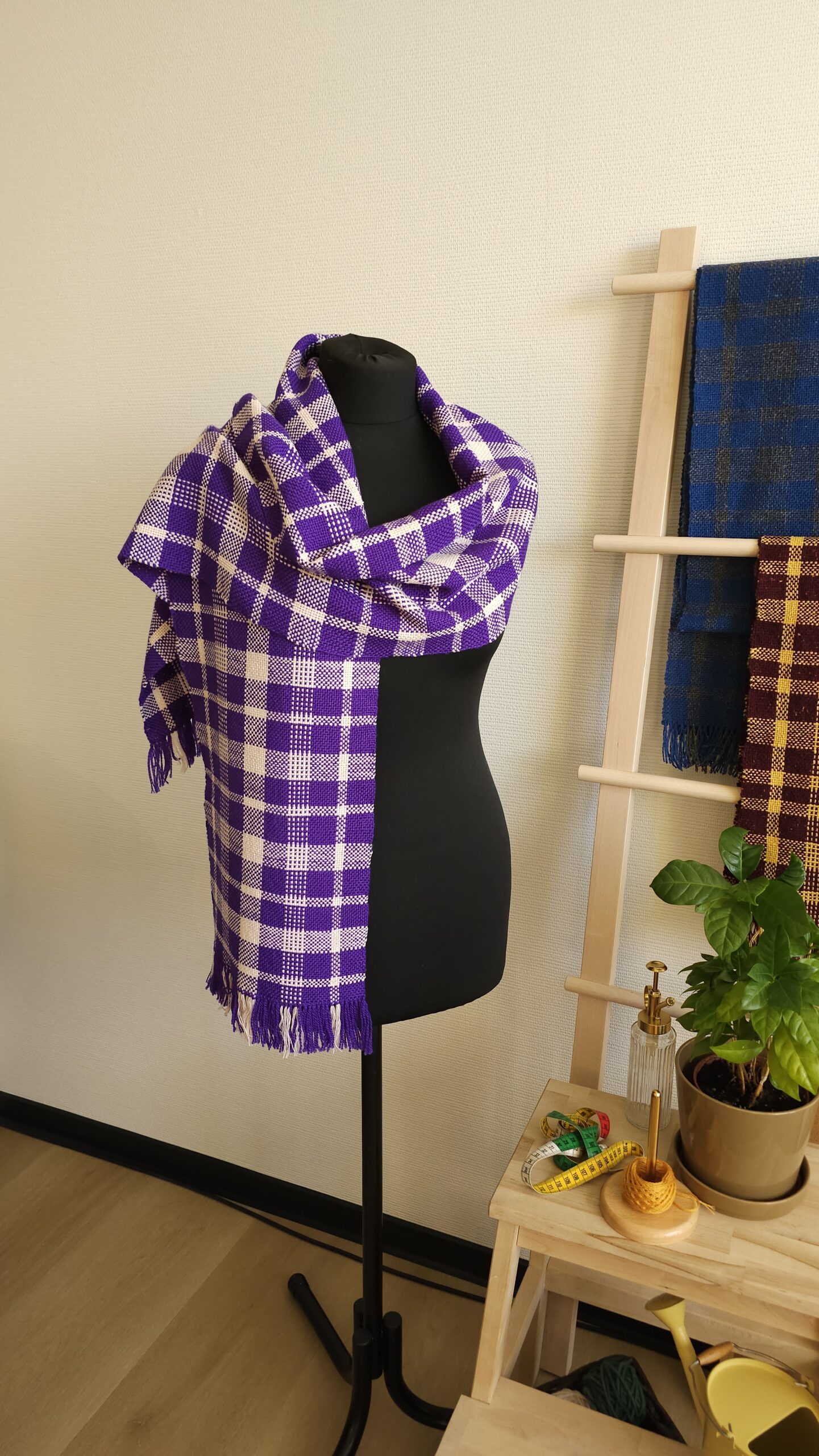 A wonderful Purple white scarf made of high-quality 100% italian merino wool yarn , hand-woven, size: 188 cm x 25 cm
